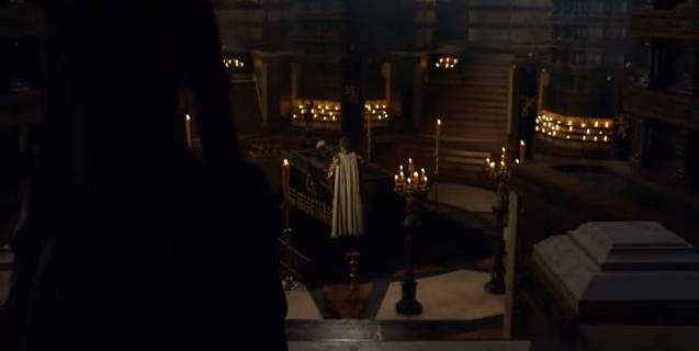 A woman is leaving the sept, while Jaime regards a body lying in state.