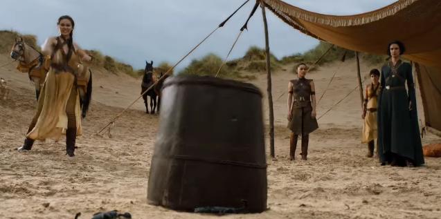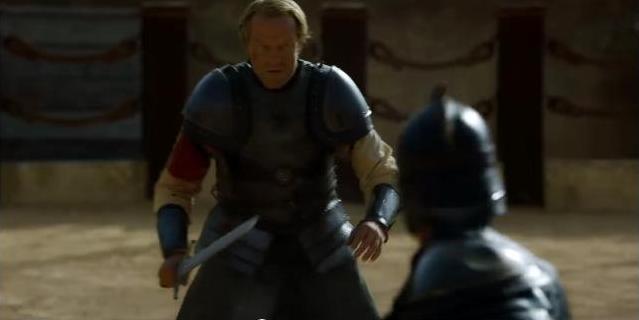 Whoa! Ser Jorah Mormont, in an arena. That looks like blood on his sleeve. KICK THAT DUDE’S ASS, JORAH!