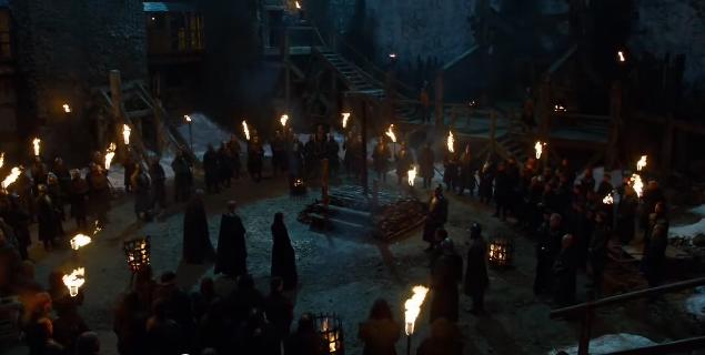 At Castle Black, where they’ve constructed a bonfire, and a tall central pole. Hmmmm.