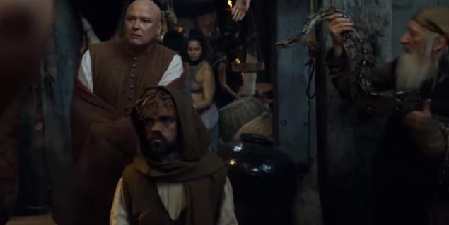 Varys and Tyrion, on the town. The old guy with the snake is visual short-hand for “exotic locale!”