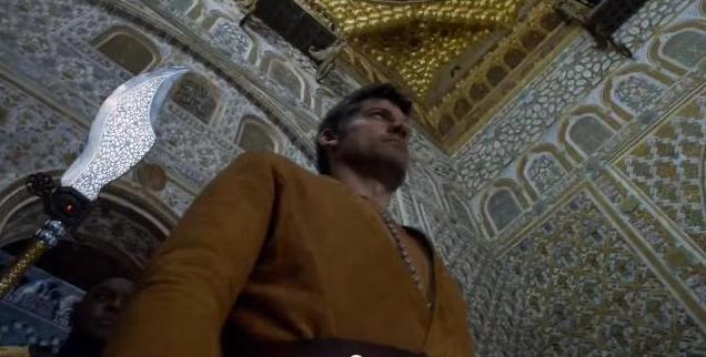 Bronn, the sell sword, extracts his sword at spear-point while Jaime Lannister looks on.