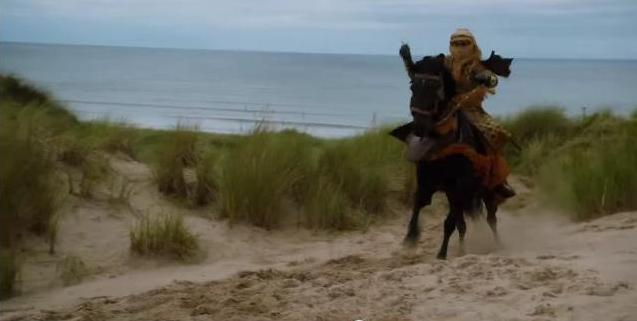 A charging rider (he’s carrying a sword but it’s invisible in the screen cap.) He’s dressed similarly to the guys who showed up last season from Dorne.