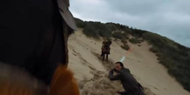 Bronn about to take down a guy on horseback. Bronn’s sword is bloody.