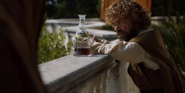 Tyrion and his best buddy. Some booze. At least he’s not in a box.