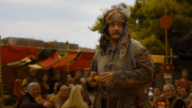 The television show has really only given us one named person (please correct me if I’m wrong) who truly counts as a fool-by-profession: the unlucky Ser Dontos who displeased King Joffrey by showing up drunk to the young king’s name-day melee entertainment.